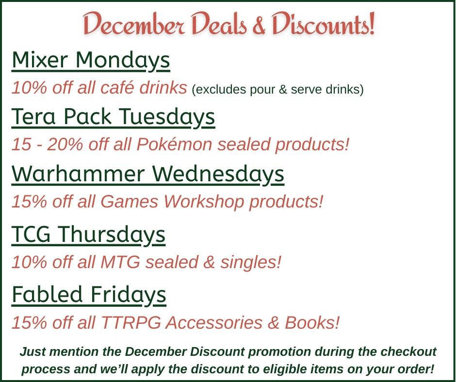 Rent one of our private game rooms for the ultimate D&D or other TTRPG session. Join one of our TCG tournaments, challenges, and weekly special events - there’s always fun to be had here, come play with us!